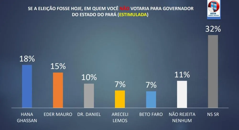 A pesquisa também mediu a rejeição aos pré-candidatos. Segundo os dados, Hana Ghassan lidera a rejeição com 18%, seguida de Eder Mauro com 15%, Dr. Daniel com 10%, Araceli Lemos com 7% e Beto Faro também com 7%. Um total de 11% afirmou não rejeitar nenhum dos nomes, e 32% não souberam ou não responderam.