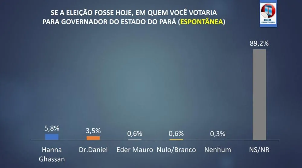 A Destak Publicidade e Marketing divulgou nesta sexta-feira (22), uma pesquisa de intenção de votos dos eleitores de Parauapebas, no sudeste do Pará, para as eleições gerais de 2026, com foco na disputa pelo governo do Estado. Na sondagem espontânea, quando o entrevistado responde sem a apresentação de nomes, a maioria se mostrou indecisa. 89,2% não souberam ou não quiseram responder, enquanto apenas 5,8% citaram Hana Ghassan, 3,5% lembraram do nome de Dr. Daniel e 0,6% mencionaram Eder Mauro. Brancos e nulos somaram 0,6%, e nenhum candidato foi citado por 0,3% dos entrevistados.