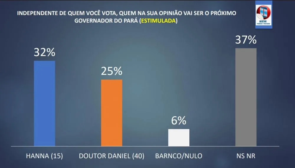 Outro dado relevante foi a percepção dos eleitores sobre quem será o próximo governador do Pará, independentemente da sua própria escolha. Nesse quesito, 32% apontaram Hana Ghassan como favorita, 25% acreditam em Dr. Daniel, 6% disseram que ninguém vencerá ou que votarão em branco/nulo, enquanto 37% não souberam responder.